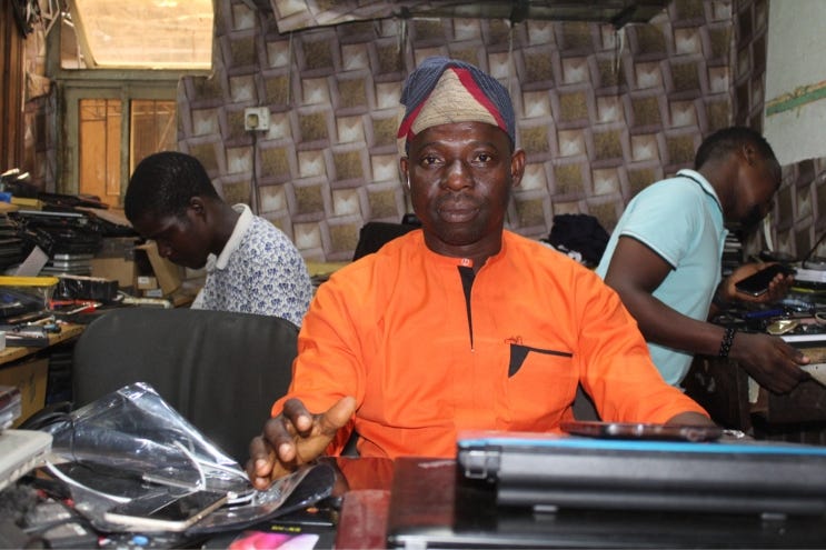 Dada Adeyinka’s office in Computer Village is nestled in a nondescript building buzzing with commerce. The passageways are dark, the sound of generators is deafening; people stream in relentlessly wielding electronic parts — the urgency is palpable. Here, time waits for no man.